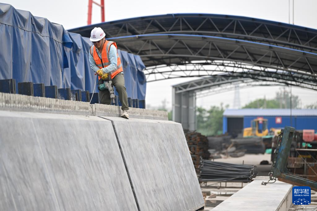 初夏时节,天津港集疏运专用货运通道工程第2标段项目施工现场一派繁忙,中铁十八局的建设者抢抓有利天气,加快施工进度。