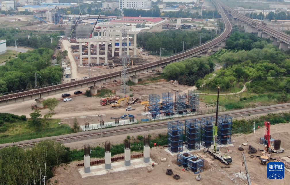 这是天津港集疏运专用货运通道工程第2标段项目施工现场一景(5月22日摄,无人机照片)。新华社记者 李然 摄