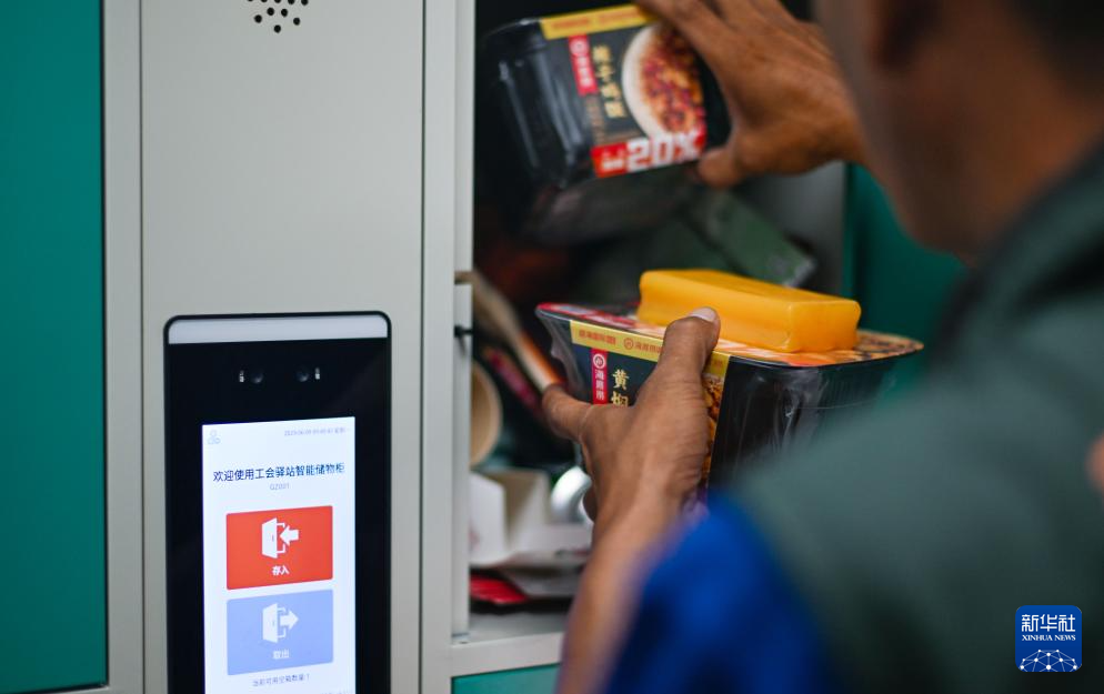 6月9日,在天津市河西区职工服务中心工会驿站,一名快递员从智能储物柜中取物品。新华社记者 赵子硕 摄