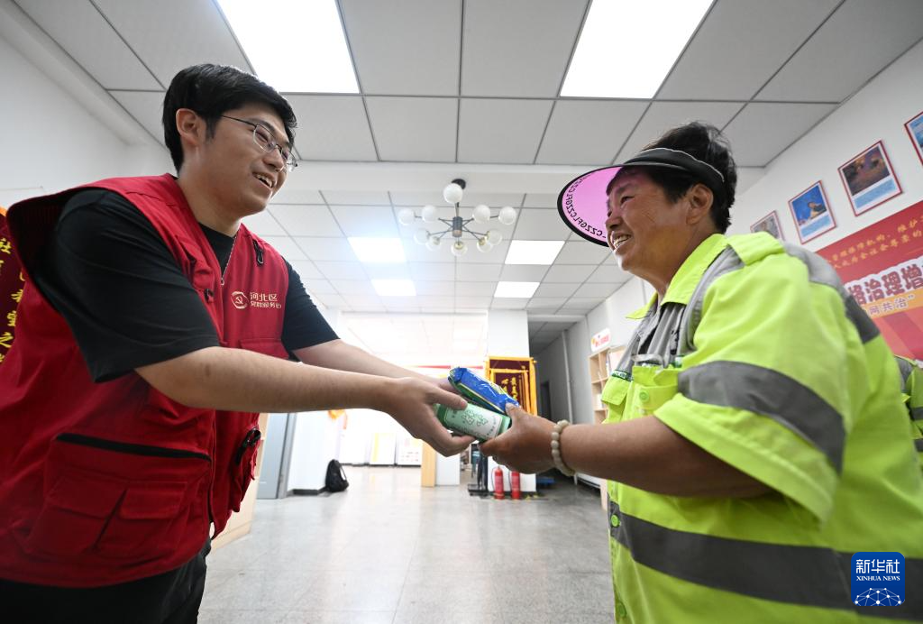 6月7日,天津市河北区昆云里社区工作人员给在工会驿站休息的环卫工人送防暑物品。新华社记者 赵子硕 摄pagebreak