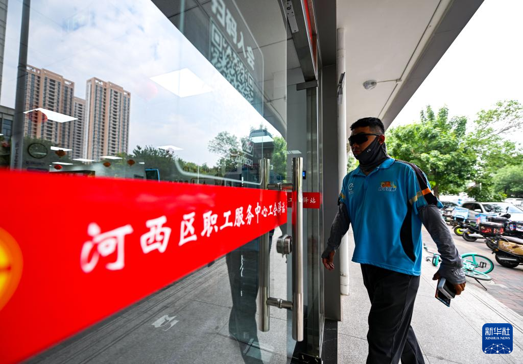 6月9日,一名外卖员走进天津市河西区职工服务中心工会驿站。新华社记者 赵子硕 摄pagebreak