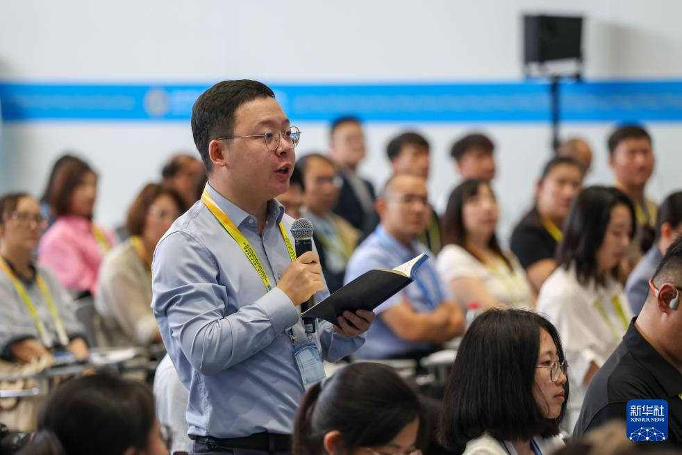 8月28日,记者在吹风会现场提问。新华社记者 孙凡越 摄