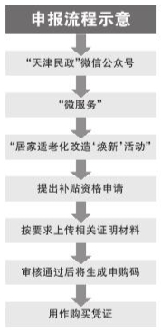 老年消费者及家庭可通过“天津民政”微信公众号—“微服务”—“居家适老化改造‘焕新’活动”移动应用端提出补贴资格申请,并按要求上传相关证明材料。居住地所在区民政部门原则上在5个工作日内,对申请人资格进行审核确认,申请材料审核通过后生成申购码,用作购买凭证。