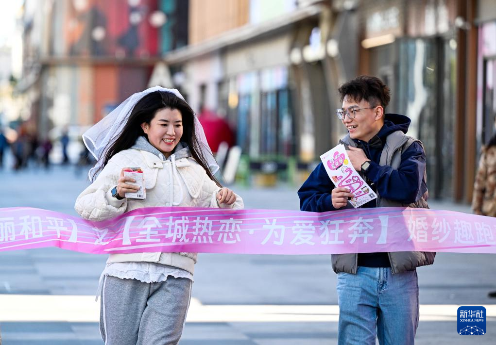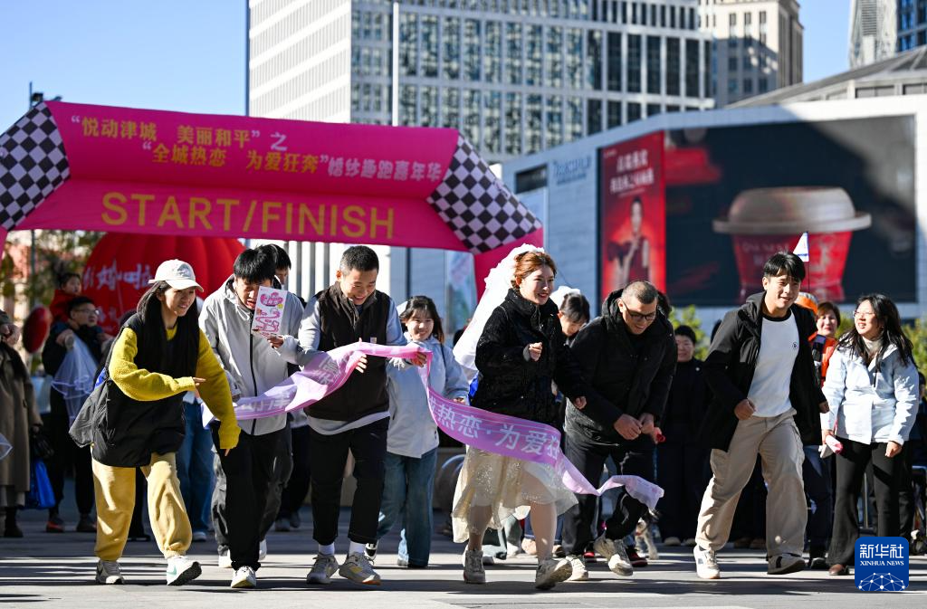 当日,由天津市和平区民政局主办的“悦动津城·美丽和平”之“全城热恋·为爱狂奔”婚纱趣跑嘉年华活动在和平区金街步行街举行,吸引了数十对情侣参加。
