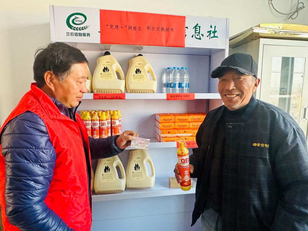 在陈官屯镇潘村“积分超市”内,村民用积分兑换奖品。(受访者供图)