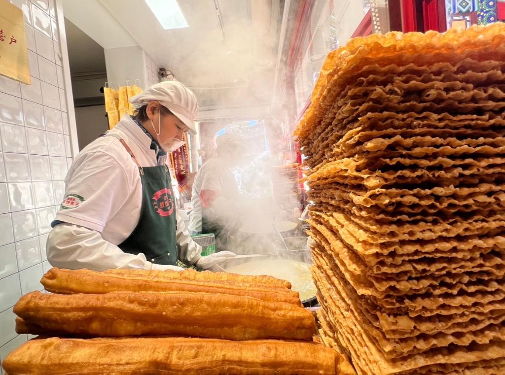 不知不觉,窗口前已排起长队,其中不乏外国面孔。“这几年西北角已慢慢成为天津饮食文化的一张名片,为了满足一些外国游客的需求,我们在很多地方设置了中英文对照标识。”西北角所在的天津市红桥区铃铛阁街道党工委副书记申梦博,为了外国顾客的体验没少想办法。
