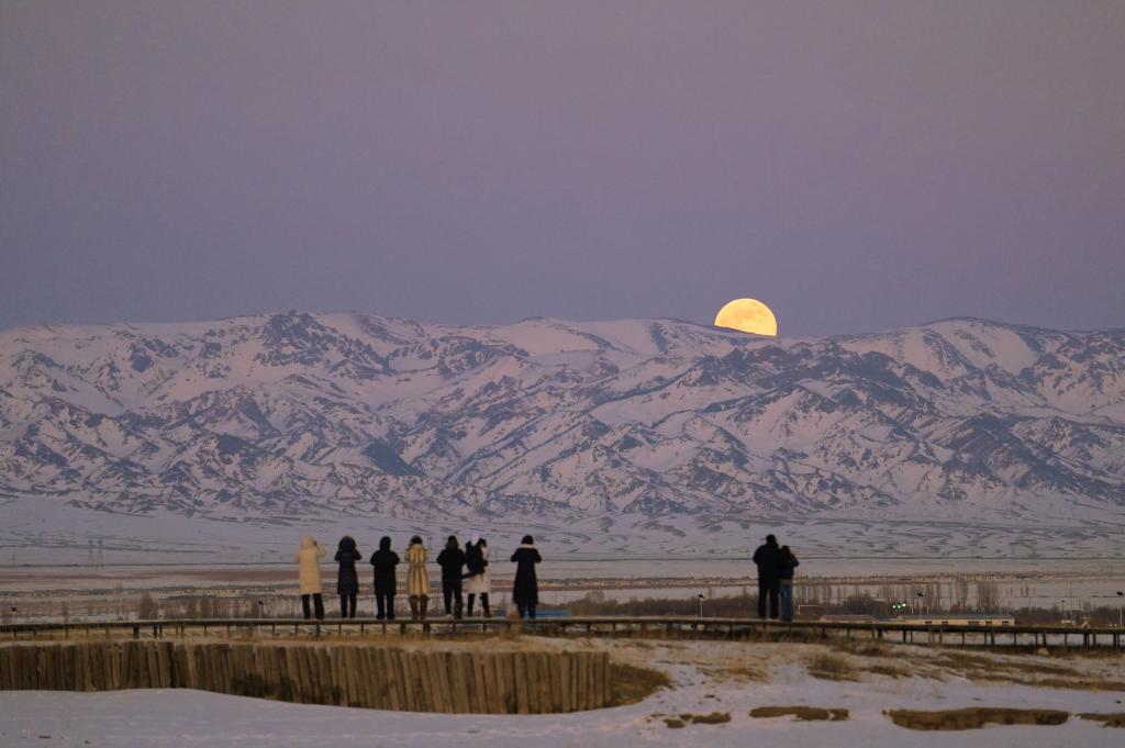 率先登场的是超级月亮,这也是2026年首个满月。“当暮色浸染雪原,一轮硕大皎洁的圆月跃出山巅,这一刻,全场的人欢呼雀跃。”王俊峰说。