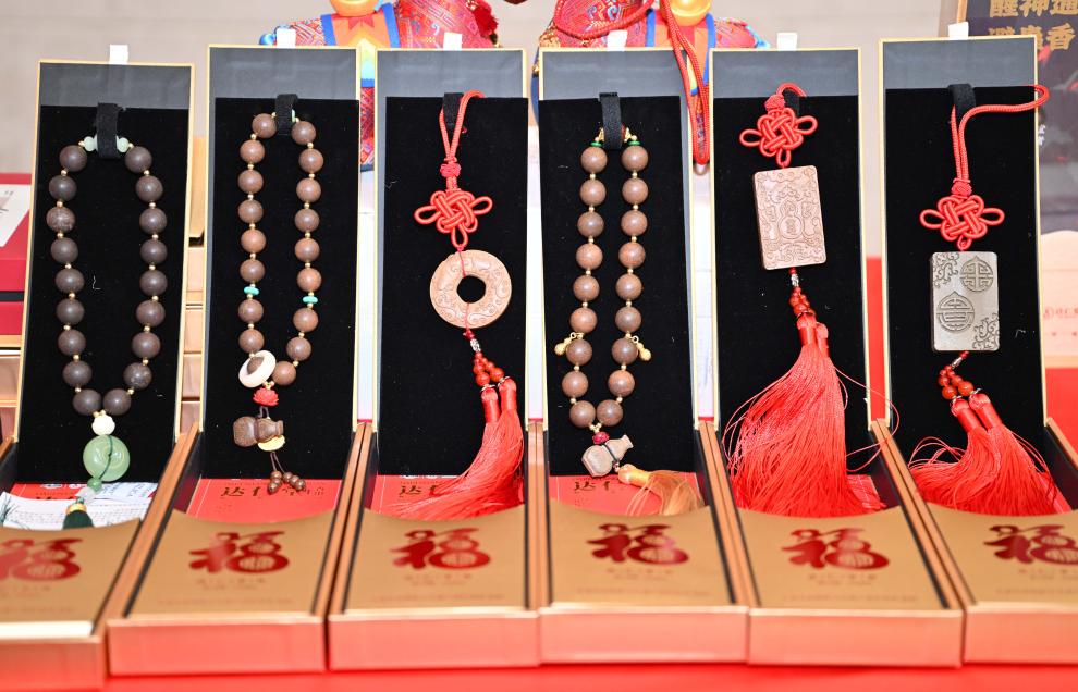 1月31日,展台上摆放的传统医药车挂、手串等文创产品。新华社记者 赵子硕 摄
