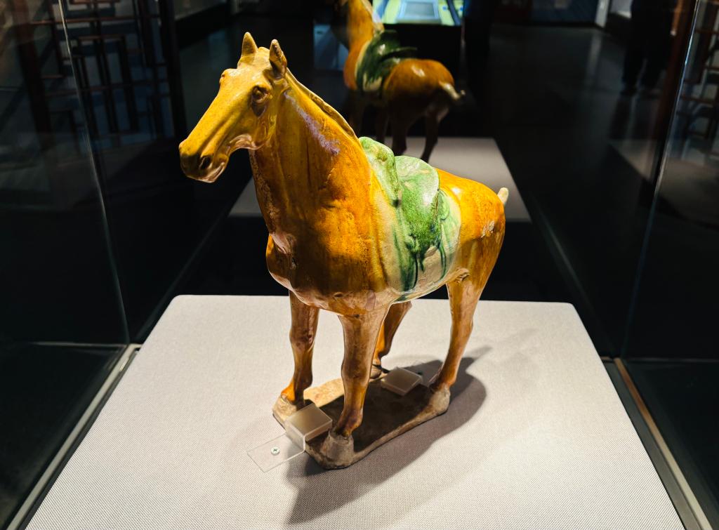 天津博物馆馆员、策展人李文静介绍,唐三彩马和一件甲骨是展览中的明星展品。提到唐代的瓷器,人们通常会首先想到唐三彩,它不仅是唐代陶瓷艺术的杰出代表,更以其绚丽的色彩和生动的造型,成为大唐盛世文化的重要象征。“唐三彩中最具代表性的就是唐三彩马,展览中的这件珍品,更是将唐马的姿态之美展现得淋漓尽致。”李文静说。