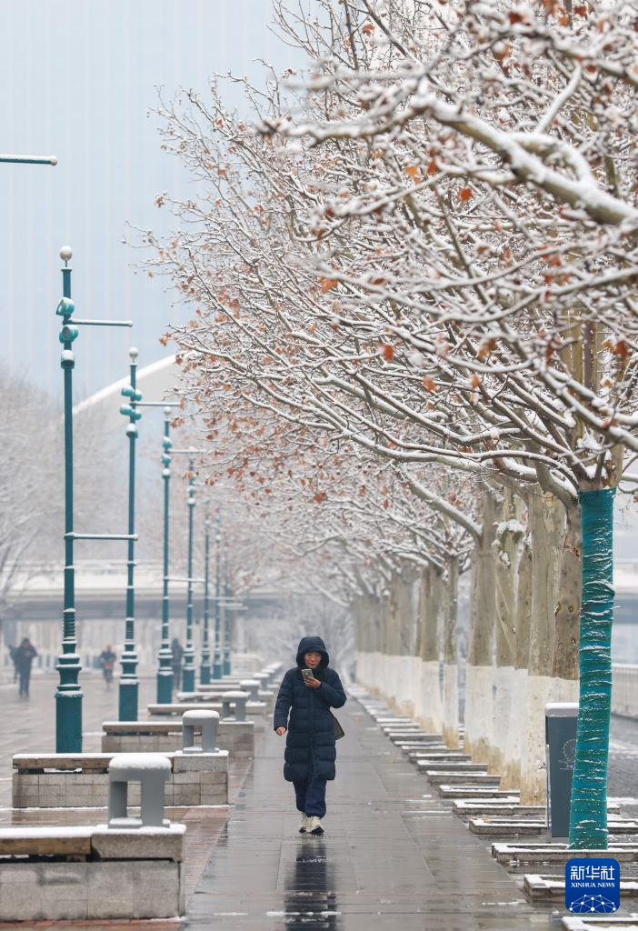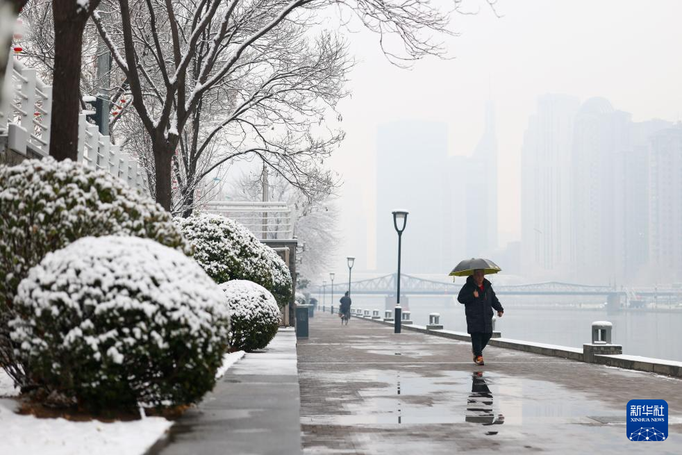3月2日,市民雪中行走在天津海河亲水平台上。新华社记者 孙凡越 摄pagebreak