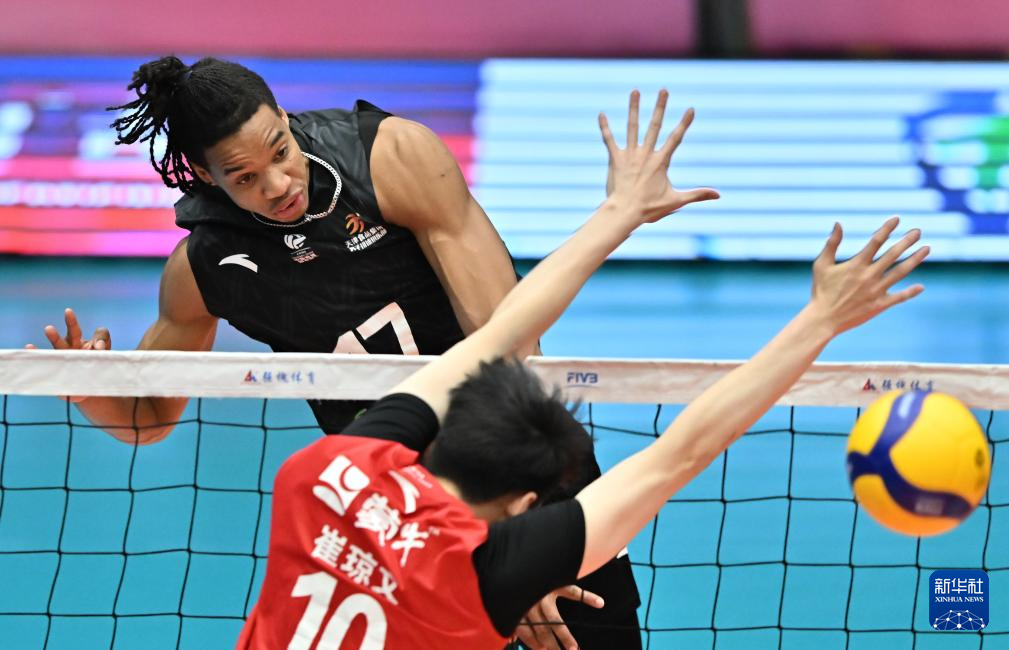 3月29日,天津食品集团队球员阿里汉德罗(上)在比赛中扣球。新华社记者 孙凡越 摄pagebreak