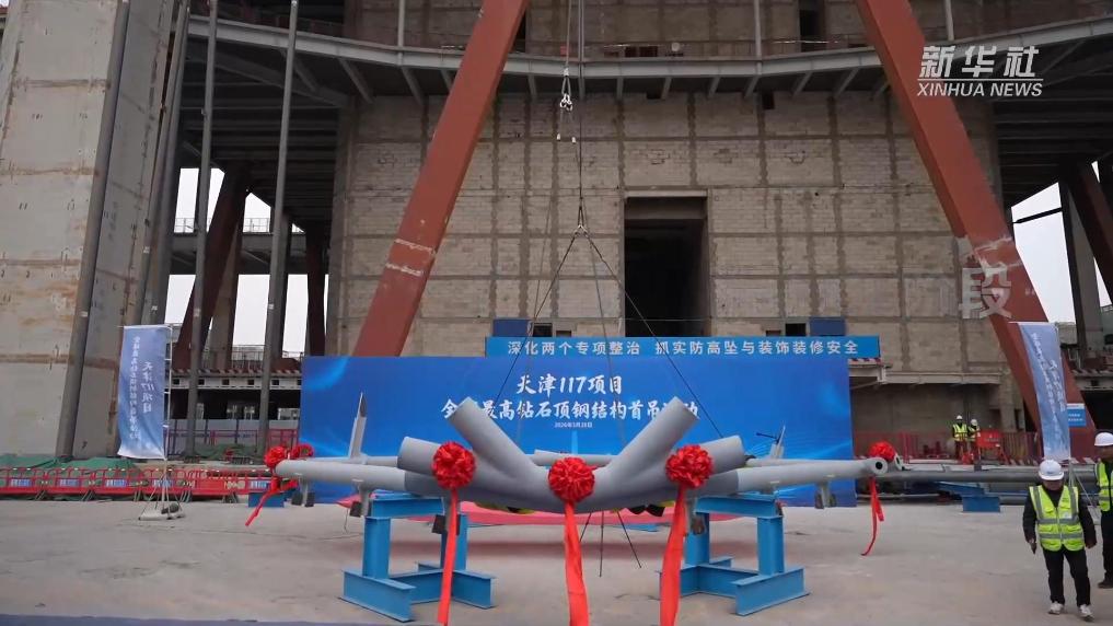 28日,伴随重约7.6吨的菱形钢结构部件升到约596米高的楼顶,天津“117项目”的“钻石顶”首件吊装成功,标志着该项目进入塔冠钢结构全面施工阶段。