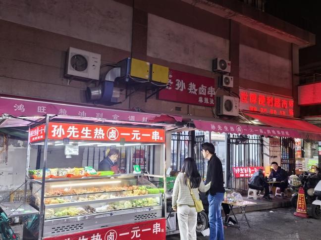 夜幕低垂,华灯初上。天津市南开区水上公园街道通园路“孙先生热卤串”店外,一些散客坐在小桌子旁。