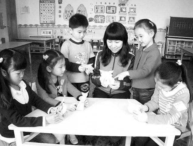 每次开展语言活动之前,孙学卉都特别注意桌椅教具的摆放。“如果是讲述文学作品,我会把桌椅摆成半圆形,让每个孩子都能和我有眼神的接触;如果是谈话活动,我会让孩子们分组坐好,并且在每张小桌子上铺上漂亮的台布,营造出温馨、愉快的氛围。这样会使孩子在心理和情感上得到放松。创设良好的环境,可以鼓励孩子思考和探索。”孙学卉这样说道。