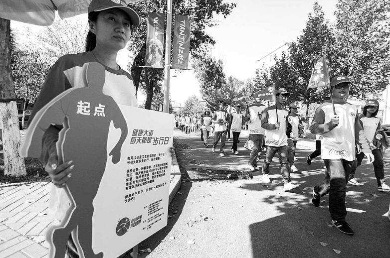 9月26日,由卫生部和中国记协主办的“中国健康知识传播激励计划(吃动平衡走向健康)”知识共享会暨天津校园行活动在天津体育学院举行。北京大学公共卫生学院李可基教授为天津体育学院师生讲解健康知识,呼吁大学生改变饮食不均衡和久坐少动的习惯,保持吃动平衡。图为专家和师生一起在校园健走。