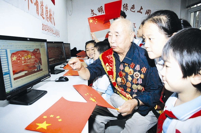 党的十八大召开前夕,和平区西康路小学组织学生走进新兴街辅恩里社区,与社区老党员、老模范一起参加"向国旗敬礼,做一个有道德的人"网上签名寄语活动。图为老劳模赵玉宽向学生介绍新中国成立和发展的历程、五星红旗的象征意义,与学生们一起在互联网上留言,祝福祖国繁荣昌盛。