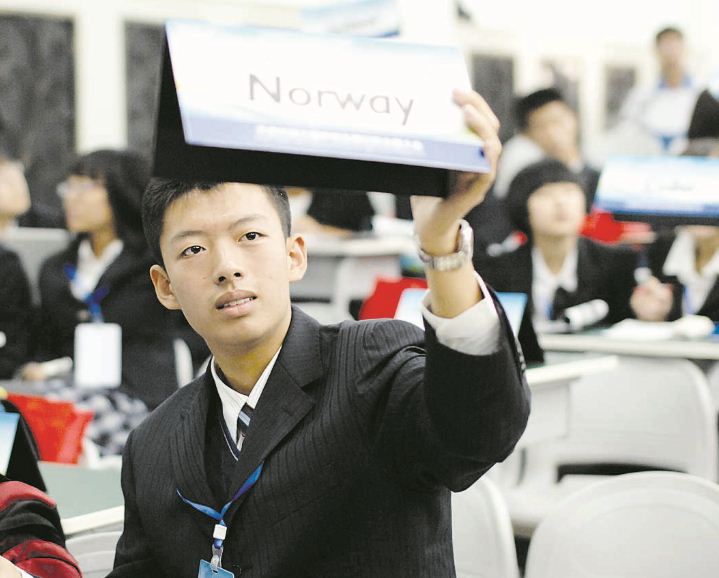校长刁雅俊说:"'模联'活动是学校实施开放式教育的一部分。学生们模拟联合国大会的工作方式,通过发言、游说、辩论、谈判等环节,理解世界各国相互依存的关系,提高国际沟通与交往的实践能力,从而拥有全球的胸怀与视野。"