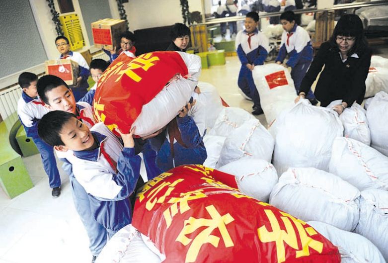 ▲日前, 河北区增产道小学开展为青海玉树地震灾区孩子捐献冬衣活动。998名师生捐献了2000余件御寒衣物及500件文具,为即将过冬的灾区小朋友送去一份温暖。