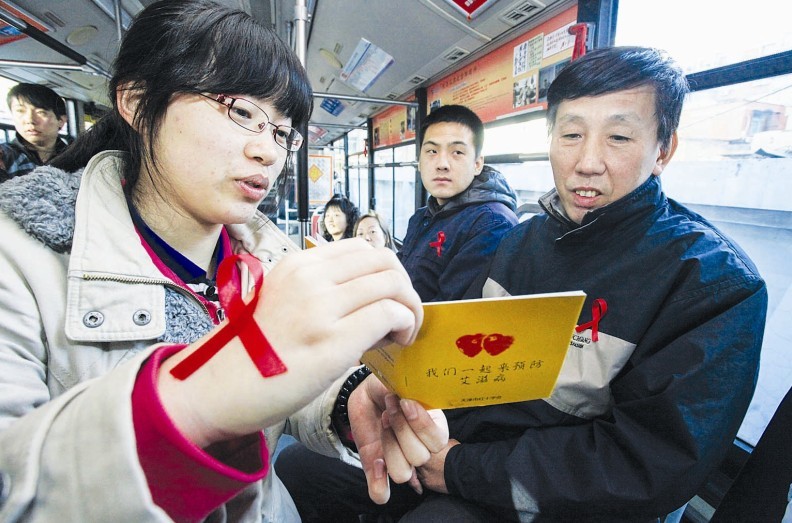 11月28日,天津医科大学基础医学院五年制团总支和公交9路车队联合发起"环城关'艾'"活动,迎接第25个世界艾滋病日到来。大学生志愿者组成多只小分队,走上45路、646路、866路公交车,沿途向司机和乘客发放红丝带,赠送预防艾滋病知识的小册子,呼吁市民不要歧视艾滋病人,提高自身安全防范意识,共同行动起来,向"零艾滋"迈进。