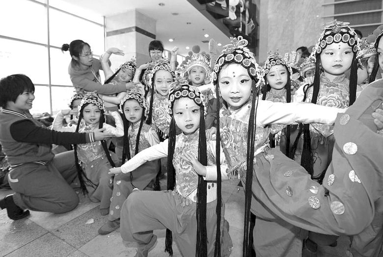 河北区第五幼儿园举办最炫民族风喜迎新年才艺表演,孩子们身穿特色服饰唱歌、表演京剧迎新年。