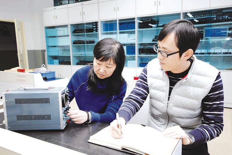 学科组长魏欣(左)、张自礼在研究新实验