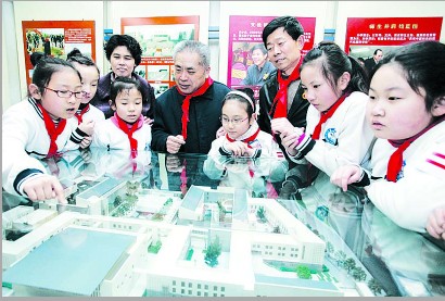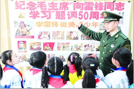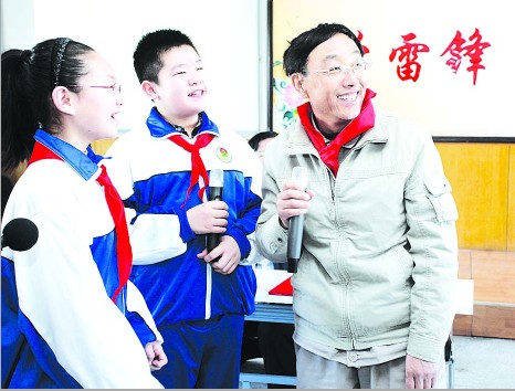 3月4日,“当代雷锋”、河东区靶 村小学的校外辅导员郭明义走进校园,和师生们一起开展“学雷锋 做榜样”主题教育活动,弘扬雷锋精神,纪念毛泽东同志题词“向雷锋同志学习”50周年。刘东岳 摄