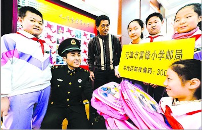3月1日, 天津市雷锋小学与红桥区邮政局合作建立的“雷锋小学学生邮局”正式投入使用。雷锋班现任副班长曲宗明(左二)受邀担任名誉局长,并受理了第一笔业务,把学生们用压岁钱买来的学习用品寄送给边远山区的贫困孩子。刘东岳 摄