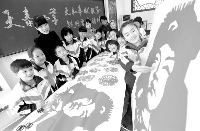 今年3月5日是毛泽东同志“向雷锋同志学习”题词50周年纪念日。当日,河北区天泰小学“‘秀’出心中雷锋”校园剪纸作品展拉开帷幕,学生们用自己的双手展现心中雷锋叔叔的光辉形象。