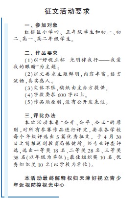 梁为了普及爱眼、护眼知识,增强学生爱眼、护眼意识,3月13日上午,由红桥区教育局保健所和天津好视立青少年近视防控视光中心联合举办的“好视立杯 光明伴我行——我爱我的眼睛”有奖征文大赛启动仪式在市师附小举行。