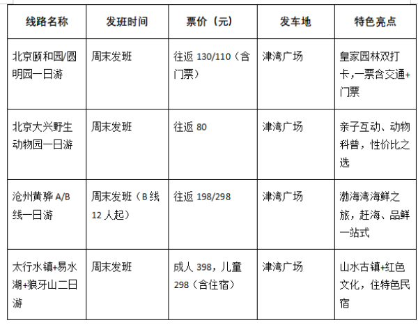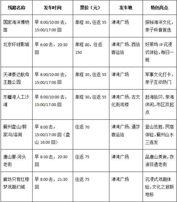 天津市交通集团积极对接京津冀三地的文旅重点景区,在提升服务品质的基础上,大力拓展、优化精品旅游直通车线路,首批20条精品线路于2025年4月9日全线开通。
