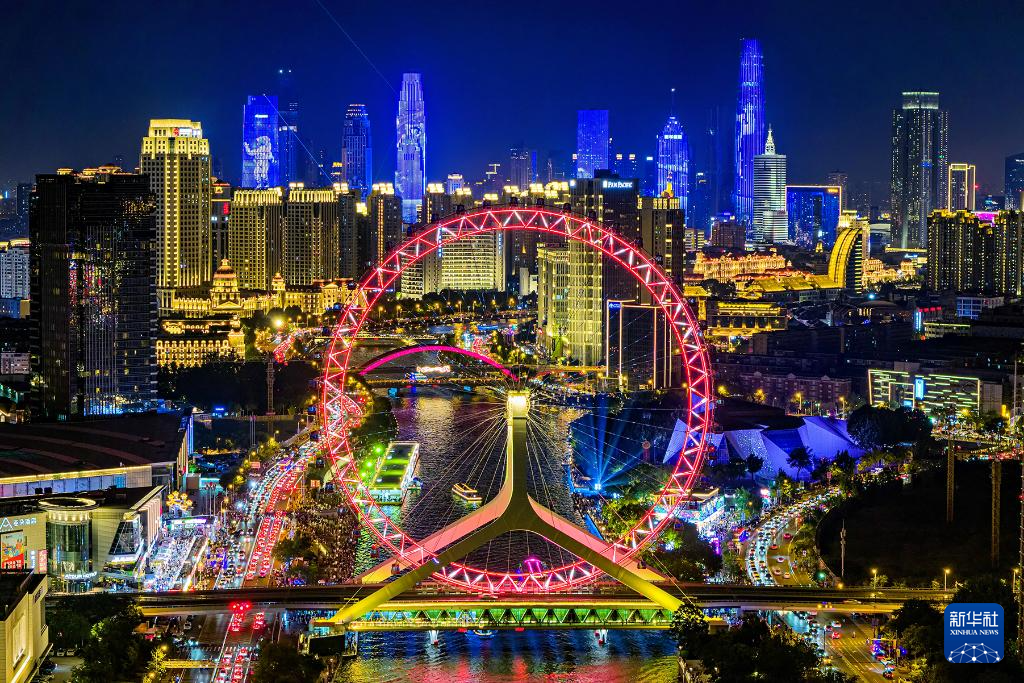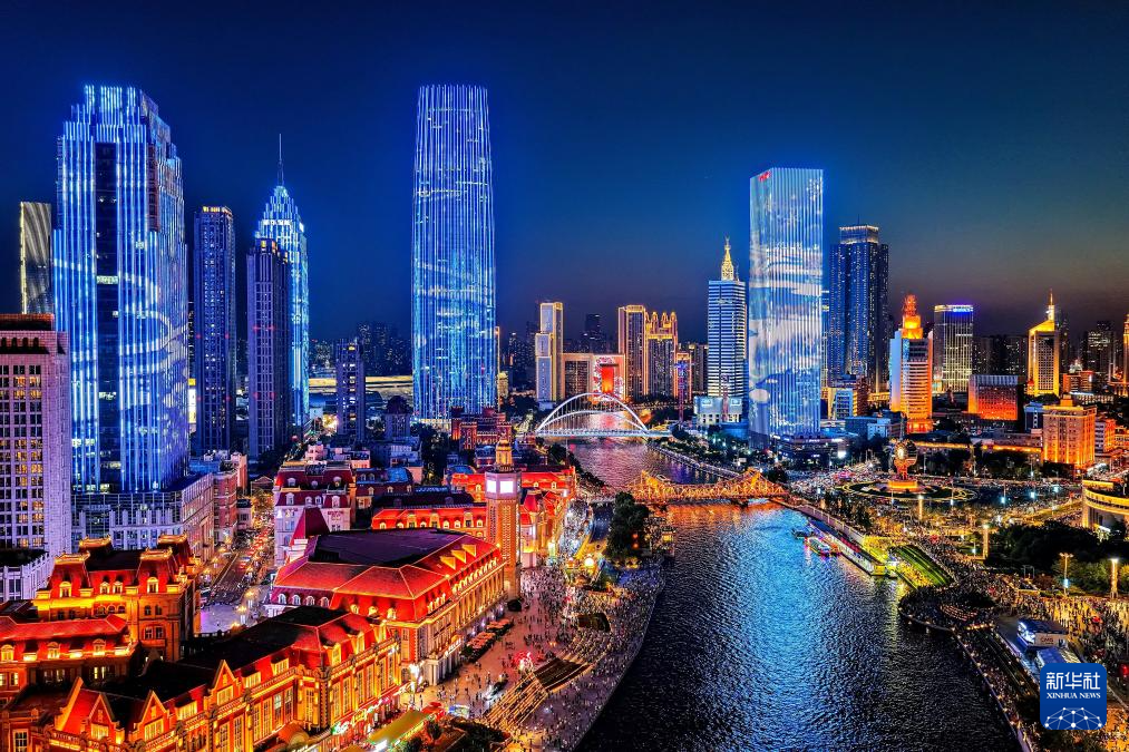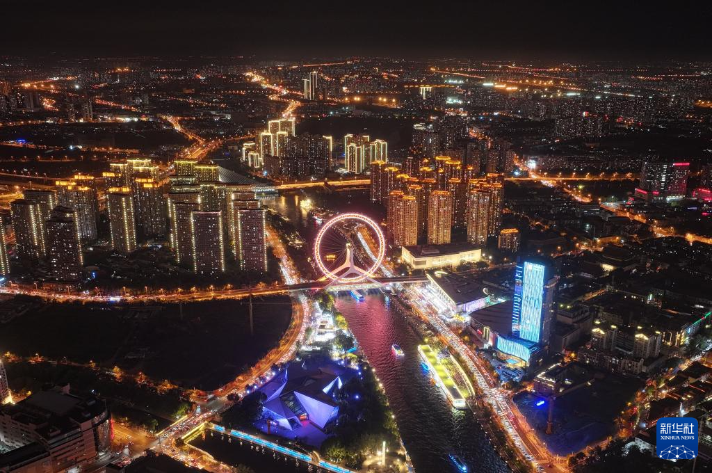 这是8月25日晚航拍的天津海河夜景(无人机照片)。新华社发(杜鹏辉 摄)