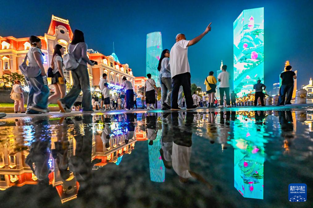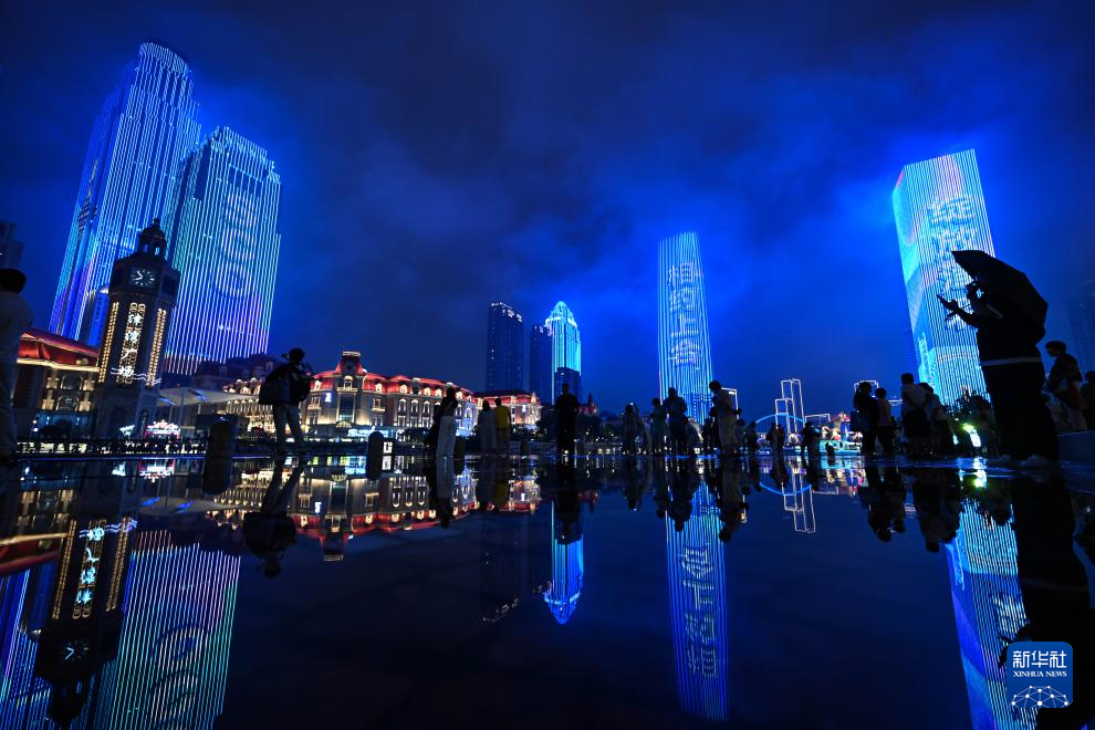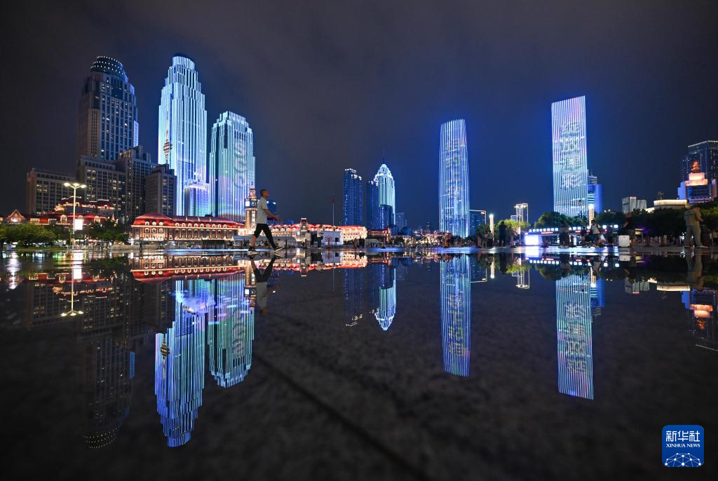 这是在天津站前广场拍摄的“海河之夜”灯光秀(8月22日摄)。新华社记者 孙凡越 摄pagebreak