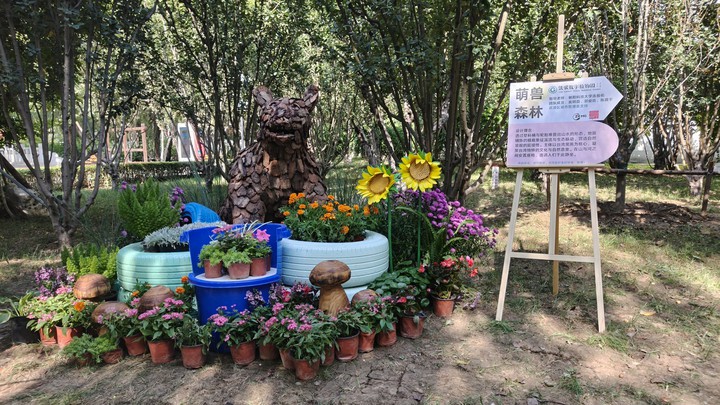 同期启幕的健康零碳微花园市集,是科研机构与公众共同践行低碳理念的创新平台。多家国内外高校参与艺术创作,包括天津大学、北京林业大学、中国农业大学等。利用PVC管材、演唱会海绵棒、鸡蛋托、塑料瓶、轮胎等日常废弃物,通过艺术设计焕发新生,成为园内兼具创意与感染力的生态景观。