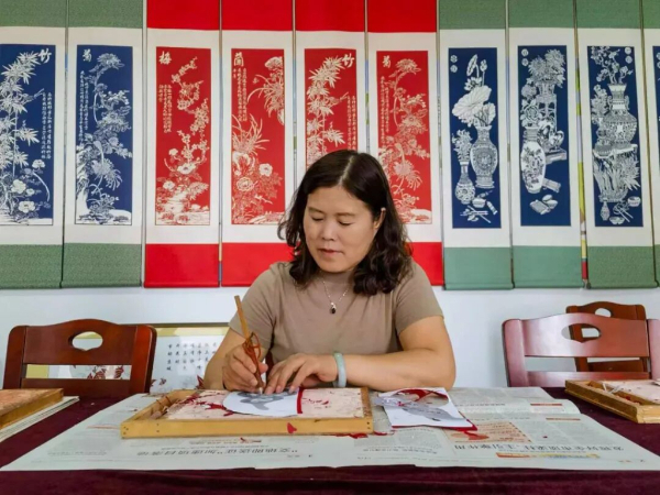 谁说剪纸只能是“红窗花”的代名词?在大郑剪纸第四代传承人刘长会的工作室里,传统剪纸与现代设计碰撞出奇妙火花。近年来,大郑剪纸在作品内容上不断创新,积极与现代元素相结合,融合了名画元素、城市元素等,富有极强的地域特色和文化内涵。“为了加强非物质文化遗产的建设,我还设计了一些文创产品,比如冰箱贴、小钥匙扣等,通过这些文创产品,让大家更多了解大郑剪纸。”刘长会手中的剪刀开合,剪出非遗活态传承的新路径。