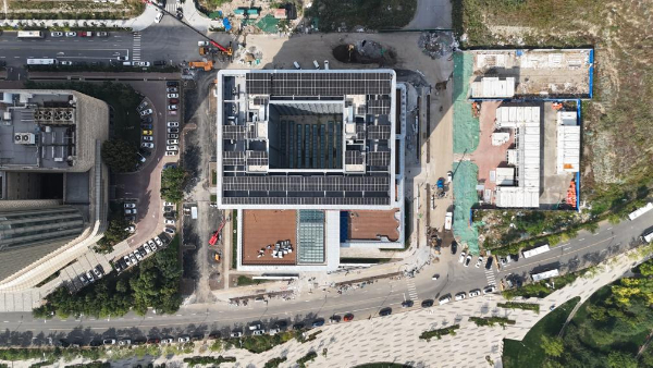 该项目是中国北方首座单体面积超2万平方米的超低能耗建筑。项目充分利用区域地热资源,依托地源热泵系统实现冬季供暖与夏季制冷,相比传统空调节能30%以上;屋面铺设的350块光伏组件,年发电量可达40万千瓦时,持续为建筑供应清洁电力;幕墙的角度设计在优化室内视野的同时,进一步增强了建筑蓄热性能,有效降低运行能耗。