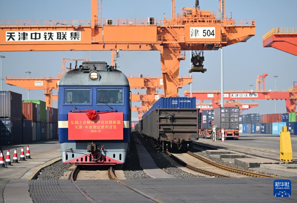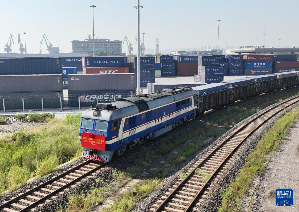 10月13日,伴随嘹亮悠长的鸣笛声,一列满载家电产品、汽车配件等货物的中亚班列从中铁天津集装箱中心站出发,将经由霍尔果斯口岸出境,驶向哈萨克斯坦等地。