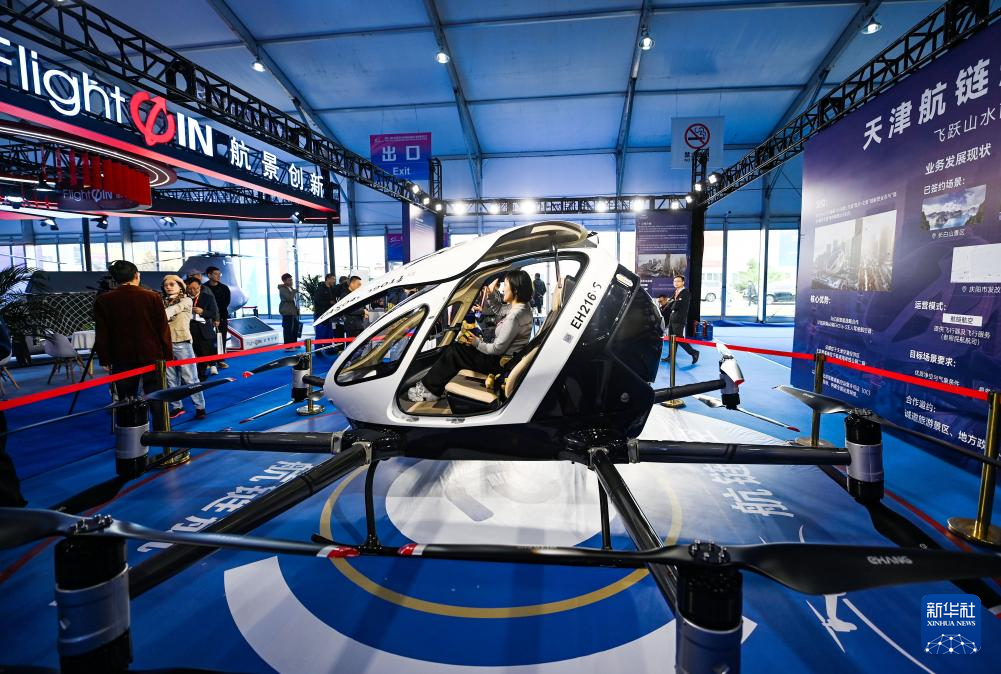 10月16日,观众在天津直博会低空经济馆内体验一款垂直起降(eVTOL)航空器。新华社记者 赵子硕 摄pagebreak