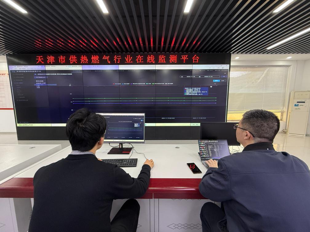 走进天津市供热燃气管理事务中心,智慧供热监管平台大屏上,红色供水温度线、蓝色回水温度线等曲线实时跳动,全市14家热电厂、576座热源供热运行数据及377座燃气锅炉房数据一目了然。