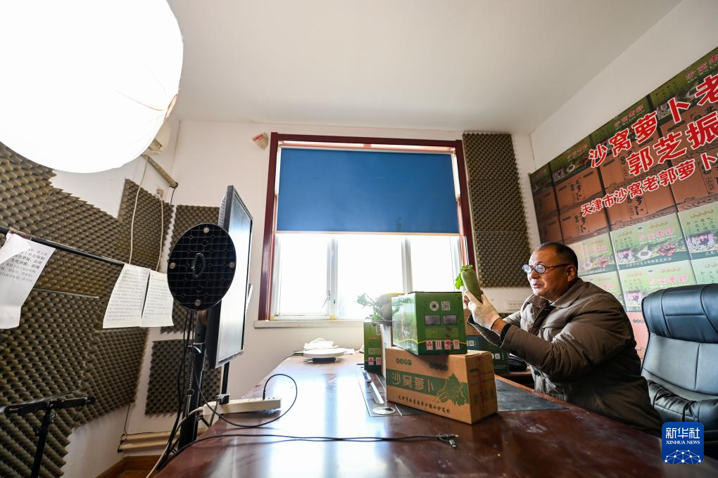 11月20日,在天津市西青区辛口镇一家萝卜专业合作社,农户在直播推广沙窝萝卜。新华社记者 赵子硕 摄
