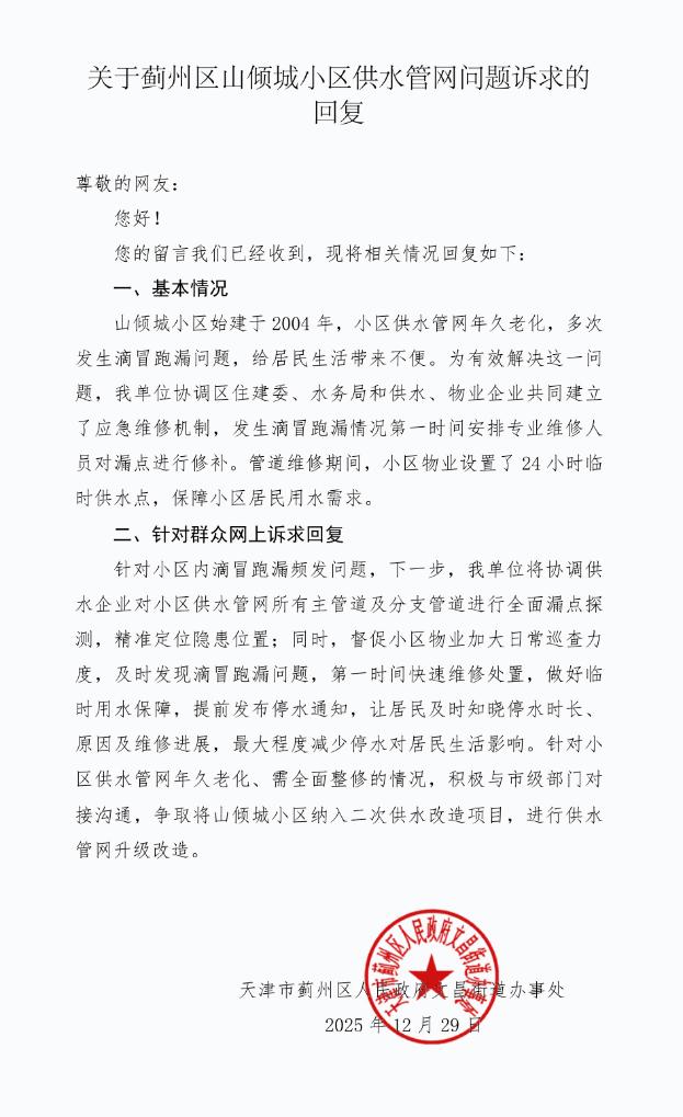 近日,有网民向新华网“我为群众办实事”网络平台天津专区反映,天津市蓟州区山倾城小区二次供水管道存在经常性爆裂问题,自2025年至今已停水维修40多次,每次停水1天至3天不等,居民需要长期储备用水,给居民日常生活带来很大不便。小区二次供水设施管道发生漏水事件已达2年之久,期间,居民多次联系物业、居委会、自来水公司等相关部门均未得到妥善解决。针对居民所反映问题,新华网向相关部门进行了求证。