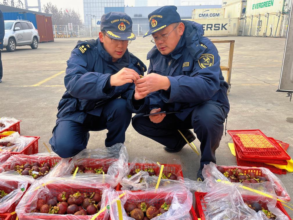 为保障山竹新鲜进口,天津新港海关设立服务专员,主动对接企业,详细了解山竹特性、运输方式及运输路线等,全程指导办理检疫许可证、提前申报等各项手续,提供“优先审单+优先查验+优先检测”全链条服务,确保各环节无缝衔接、高效运转。