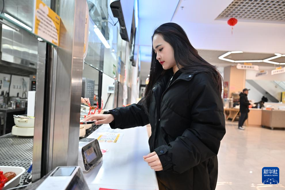 泰国学员黄雅仪在中国民航大学使用支付宝进行午餐付费(1月20日摄)。新华社记者 孙凡越 摄pagebreak