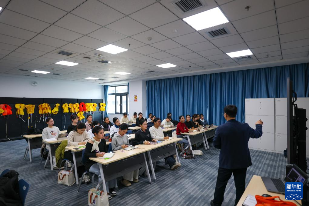 中国民航大学教师迟壮(右)对泰国学生进行客舱安全管理课程授课(1月8日摄)。新华社记者 孙凡越 摄pagebreak
