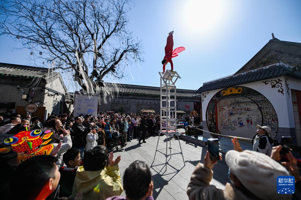 2月22日,游客在杨柳青古镇观看杂技表演。新华社记者 赵子硕 摄