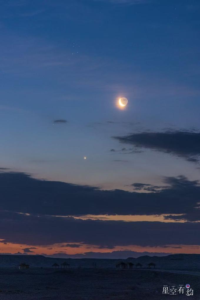 3月23日晚,天宇将“上线”月伴昴星团。届时,弯弯的蛾眉月和明亮的昴星团近距离相伴,感兴趣的公众可尝试观赏。