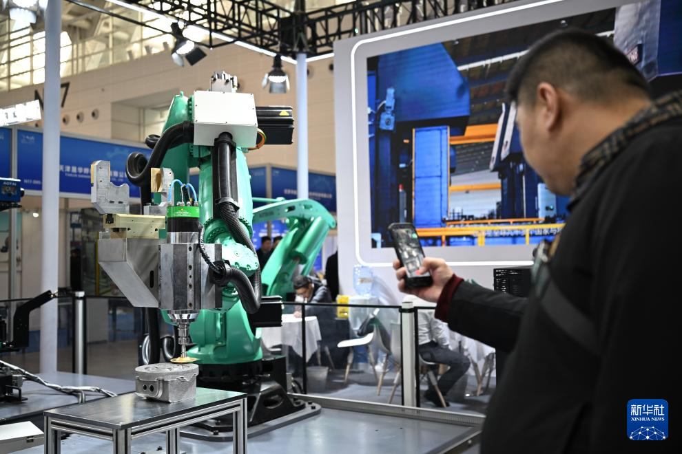 3月18日,观众在天津工博会上参观一款打磨工作站。新华社记者 孙凡越 摄pagebreak