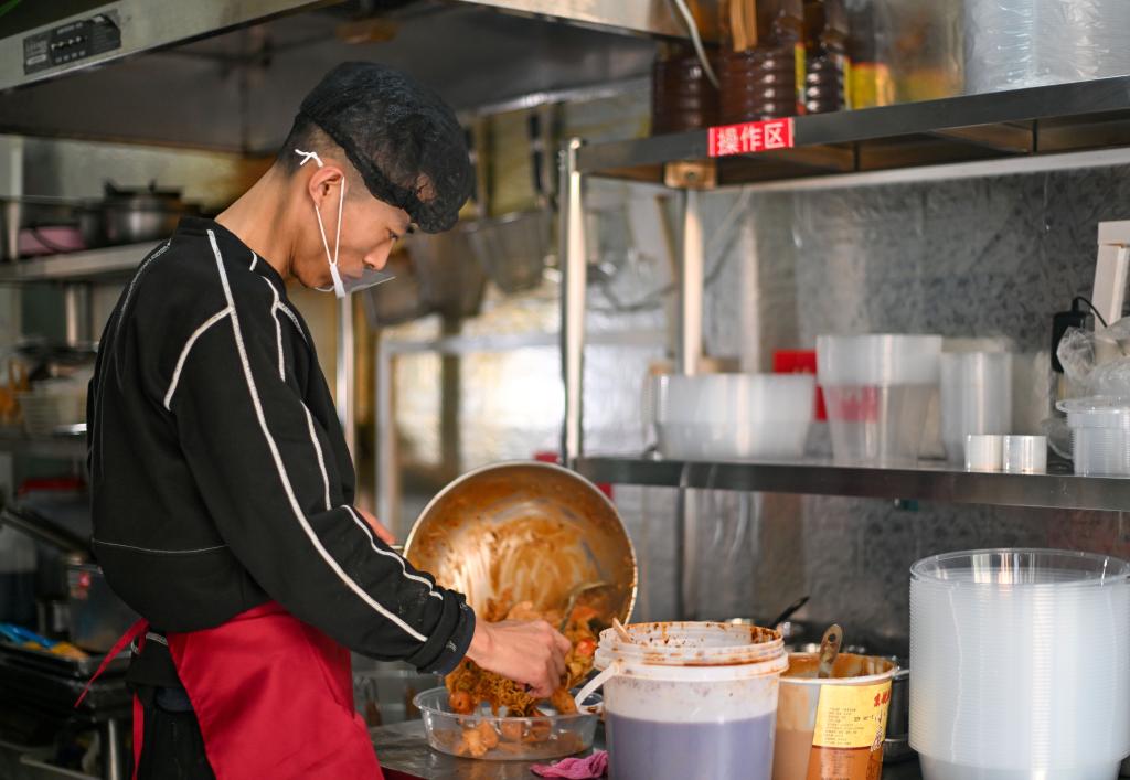 店长赵磊走起路来有些特别,因为多年前的一场意外致使他右腿截肢成了残疾人。靠着积极的心态和做麻辣拌的手艺,他咬牙撑起了自己的小店与生活。
