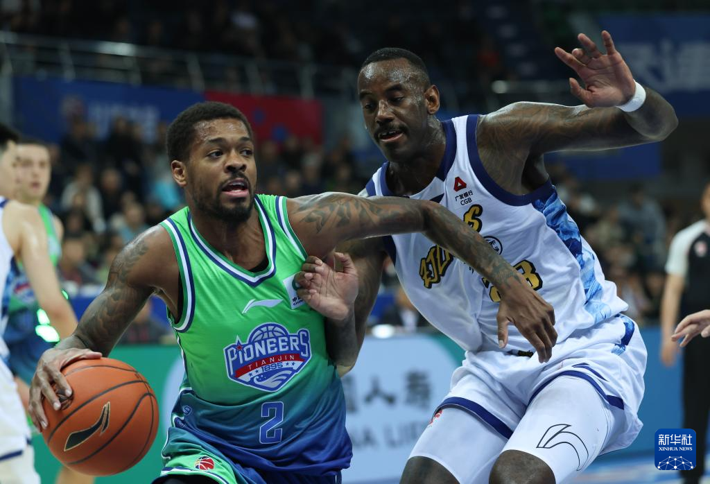 3月24日,天津先行者队球员贾维恩·哈姆雷特(左)在浙江浙商证券队球员贾卡尔·桑普森的防守下进攻。新华社记者 孙凡越 摄pagebreak