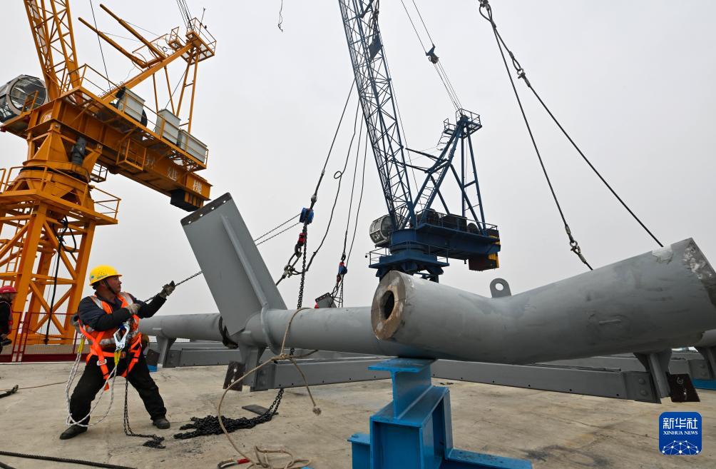 3月28日,天津“117项目”的菱形钢结构部件准备开始吊装。新华社记者 赵子硕 摄