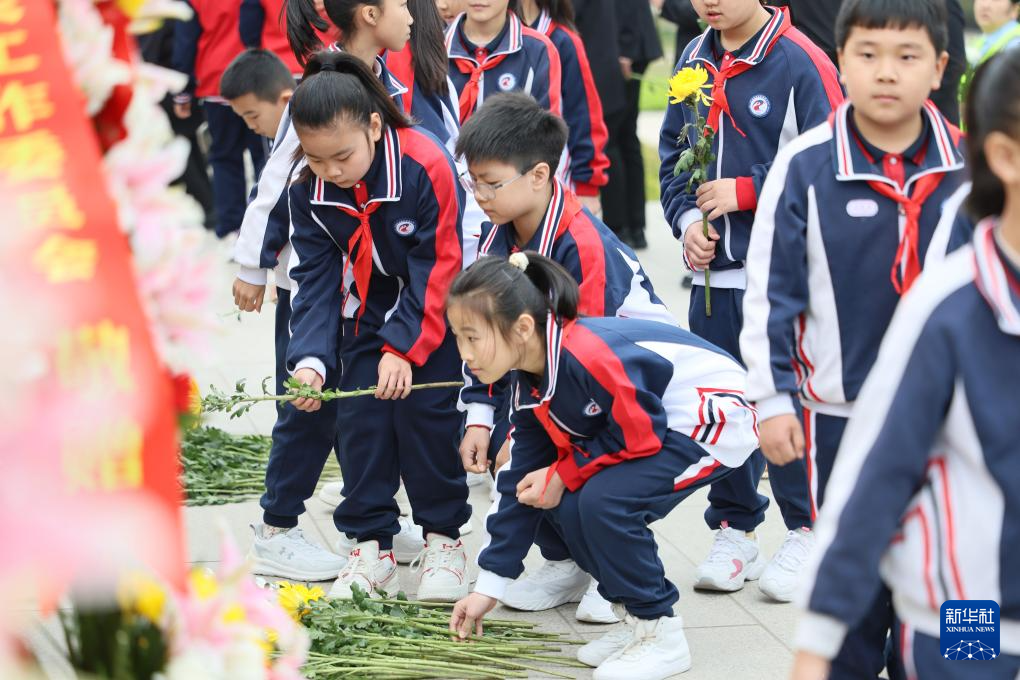 4月3日,少先队员在纪念碑前献花。新华社记者 李然 摄pagebreak